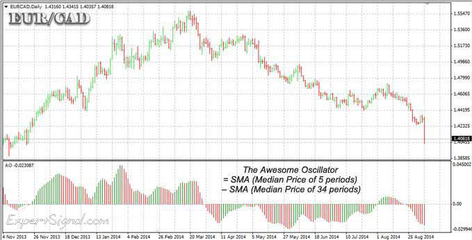 The Awesome Oscillator is calculated by subtracting the 34-period SMA from the 5-period SMA of the median price: